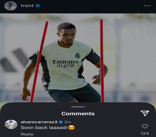 雷速体育10月15报道 皇马球星阿诺德更新社媒:“很快回归”,在此前晒出的皇马训练照中,阿诺德已归队参加训练。