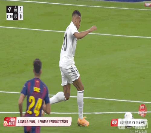 雷速体育10月26报道 西甲第10轮,西班牙国家德比,皇家马德里坐镇主场伯纳乌迎战巴塞罗那。比赛第22分钟,姆巴佩接贝林厄姆直塞先拔头筹。