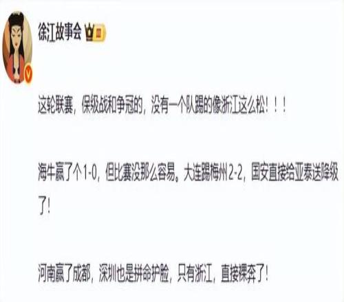 另一位媒体人徐江则将“矛头”指向上海海港主场对阵浙江的比赛。这场比赛海港3球完胜浙江,徐江认为浙江的表现过于放松。“这轮联赛,保级战和争冠的,没有一个队踢的像浙江这么松!海牛赢了个1-0,但比赛没那么容易。大连踢梅州2-2,国安直接给亚泰送降级了!河南赢了成都,深圳也是拼命护脸,只有浙江,直接裸奔了!”徐江声称。