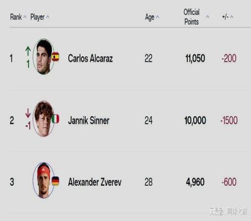 而辛纳则是被扣掉去年总决赛冠军的1500个积分,世界一哥的宝座被西班牙红星阿尔卡拉斯重新占据。当然,辛纳阿卡两人关于年终排名世界第一的争夺还没有结束,但是阿卡无疑机会更大。