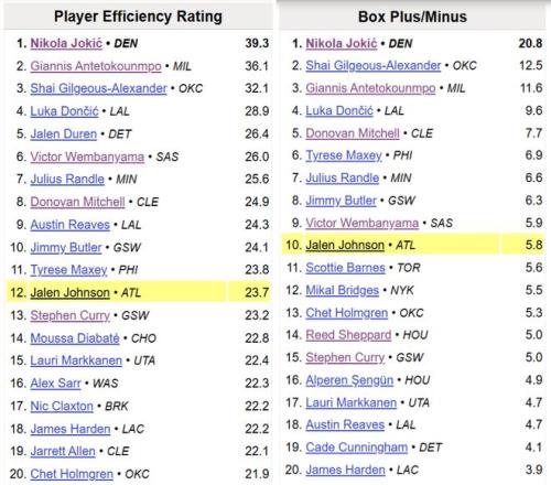 高阶数据方面,也能看出杰伦约翰逊正在展现一些不同的东西:目前杰伦约翰逊的PER值是23.7、BPM是+5.8,这两项都是生涯最高(此前最高PER值17.3、BPM+1.9),而且分别排在全联盟第12和第10。
