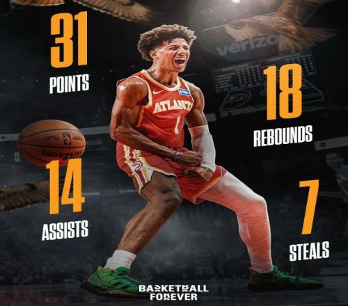 拿上一场对阵爵士的比赛来说,杰伦约翰逊打出了生涯最强的一场比赛:全场出战41分钟,投篮19中10,三分5中4,罚球11中7,拿下31分18篮板14助攻7抢断的准四双,正负值+16全队最高。