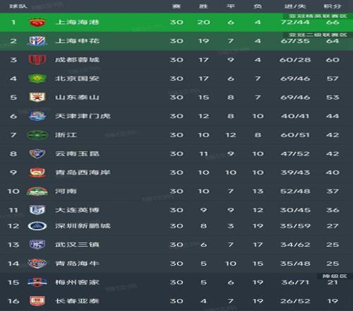 中超第30轮结束了所有比赛,最新积分榜如下!