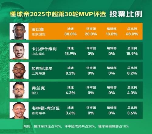 大家好,欢迎来到懂球帝2025赛季中超MVP评选现场。中超第30轮MVP得主出炉,北京国安前锋法比奥在末轮的金靴大战中,用一次大四喜帮助自己笑到最后,也帮助他以68%得票率的大幅领先优势,当选本轮中超的MVP。这是法比奥本赛季第三次当选中超MVP,并列最多。
