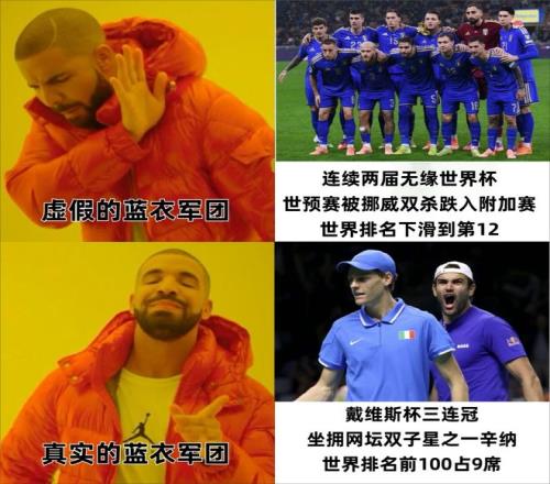 放在20年前,或者说10年前,你能想到意大利选手在各级巡回赛、杯赛上向冠军发起冲击,而曾登顶世界之巅的意大利足球男子国家队却会连续2届错过世界杯,如今又一次跌入附加赛,还要为2026年的名额拼抢一番吗?