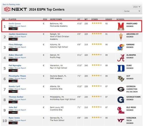 奎因的“全美第一中锋”名号是在高中时确立的,2024年他高中毕业时依靠扎实稳定的内线得分能力获得ESPN综合评分93分,五星高中生,在全美中锋位置中高居第一,随后加入马里兰大学。