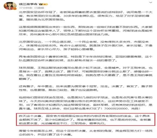 赛前,就有媒体披露河南队开出了500万赢球奖。不过,媒体人徐江在个人社交账号上发文谈及了国安这场足协杯决赛的奖金,其表示俱乐部老板周金辉拍出的奖金金额至少8位数起步,这是周老板赛前找的钱。如果徐江爆料属实的话,这意味着国安的足协杯赢球奖高达千万以上,远超河南队的500万,难怪足协杯决赛国安气势如虹,原来是重赏之下必有勇夫。